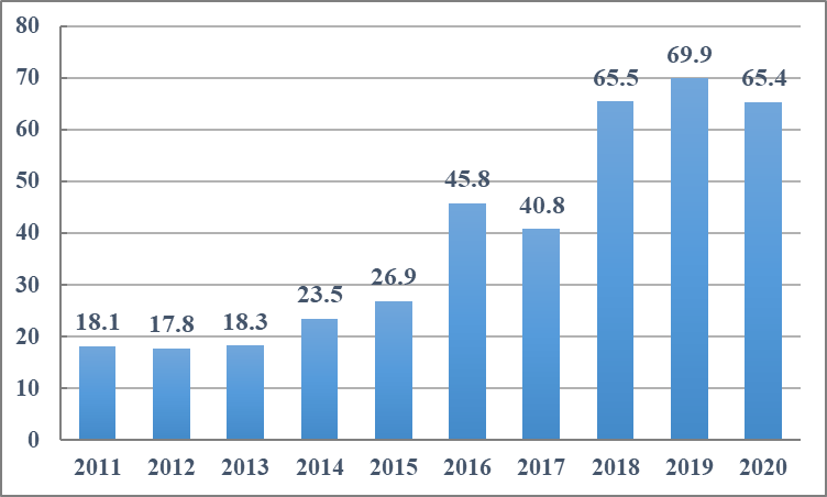图1-1合川区2011-2020年交通基础设施投资完成情况(单位:亿元)