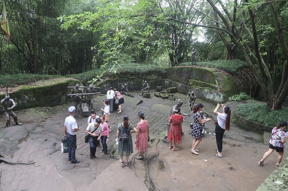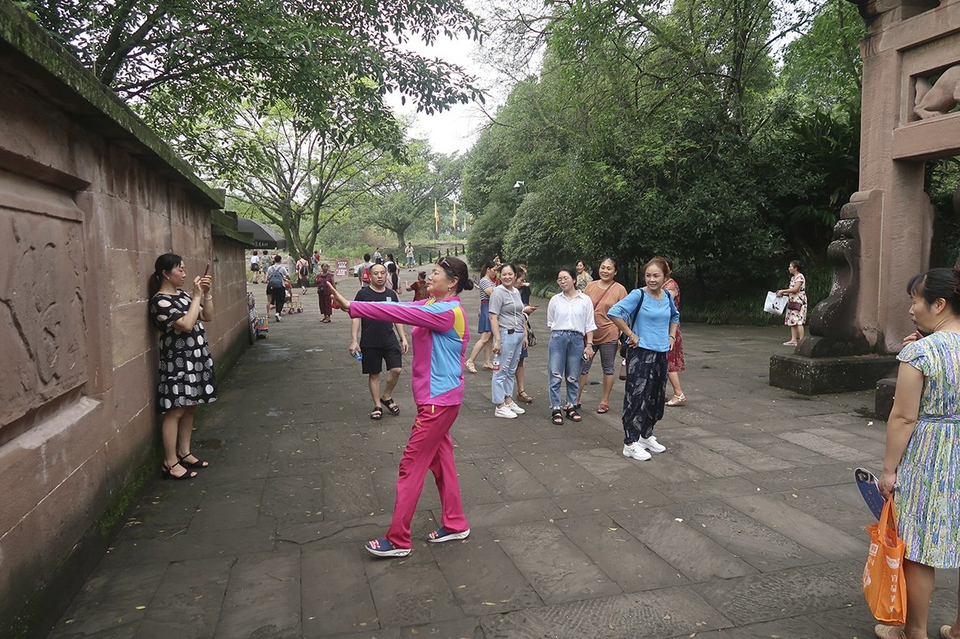 当天,记者在钓鱼城景区看到,川流不息的游客依然成百上千,几乎每个景点都成了大家眼中的“打卡地”,走到面前就要掏出手机美滋滋地“咔嚓咔嚓”一番。记者转了一圈,发现2个特别有意思的场面。在悬空卧佛处,先是有几名游客用手中的水杯在一旁的水池处接了一些泉水喝,称特别清洌甘甜。“那当然哟,这水可是我们钓鱼城山上的‘神水’,又叫‘圣水’,喝了包你身体健康,长命百岁!”一位当地村民模样的中年人听到游客们的交谈,笑着对他们说。没想到这话被路过的一群游客听到,一下子“呼啦啦”全围上来,七嘴八舌地叫喊:“这么好的水,我一定要喝!”“我也要喝!”无奈,大家只能排队品尝了;在钓鱼城护国寺前有一个巨大的石刻“福”字,每个到来的外地游客几乎都会闭上眼,尝试摸一摸这个象征好运的“福”字。记者看到一名满面笑容的中年妇女在护国门处紧闭双眼,伸直双手,径直朝面前的“福”字走去。“快了快了,要到了!”“哎呀,摸到了,有福气!”在大家的欢笑声和叫喊声中,这名妇女最终如愿。