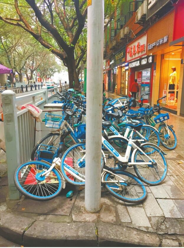 11月12日,记者在钓鱼城街道交通街看到,一大片共享单车倒伏在人行道上,场景一片杂乱,路人来来往往却没有一个人去扶起,与文明城区形象格格不入,实在太不雅观。记者袁询摄