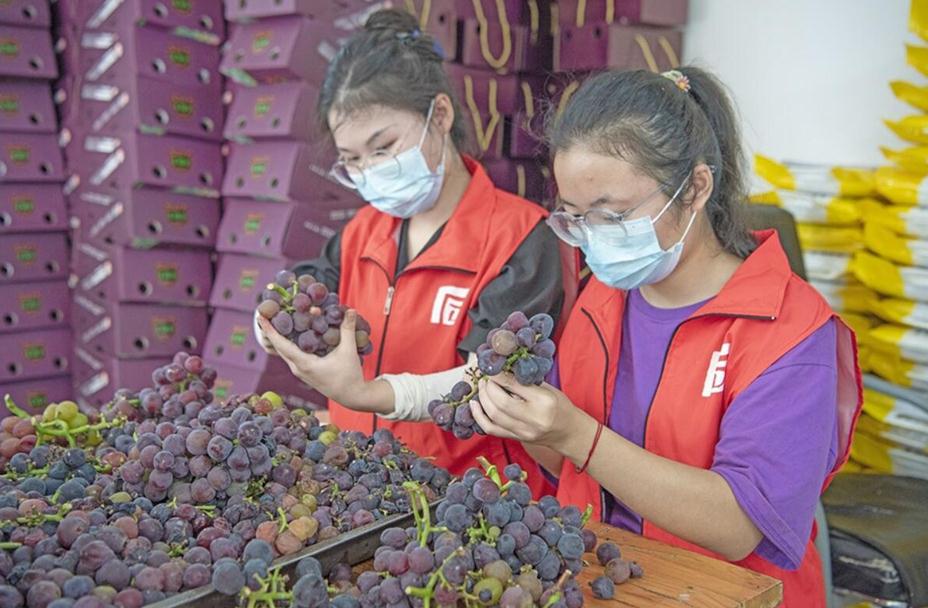 眼下正是葡萄采收时节,近日,记者在位于大石街道竹山村三组的香提多葡萄园里看到,一串串果粒饱满的葡萄挂在枝头,众多青年志愿者在果园里帮忙采摘葡萄,并将葡萄进行分拣、装筐,准备发往市场。