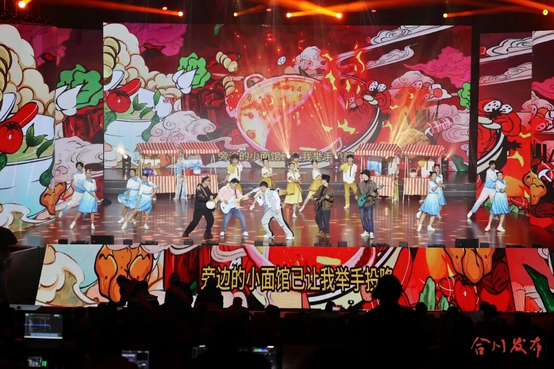 晚会分为“踏来·自然江‘成’ 山清水秀”“乘风·‘一城两人’ 薪火相传”“奋蹄·砥砺争先 实业兴区”“笃行·平安喜乐 行稳致远”四个篇章。清音表演唱《最美合川人人夸》唱出了合川的山水之美、人文之韵,唱出了合川人对家乡的深情眷恋;原创话剧《民族脊梁》选段《启航》通过精彩的演绎,展示了卢作孚先生的爱国情怀、拼搏精神;歌伴舞《行知路上》带领观众走进陶行知先生的教育世界,生动展示了他为这片土地播撒的知行合一的火种;小品《田野火锅节》带大家沉浸式解锁了合川专属滋味,让观众在欢声笑语中感受合川美食文化的独特魅力;表演唱《高粱杆儿节节甜》用轻快的川渝风情,诉说乡村振兴的丰硕成果,展现城乡融合的美好画卷……节目形式多样、内容丰富,美妙的旋律、精彩的表演,谱写了新春佳节的幸福乐章。