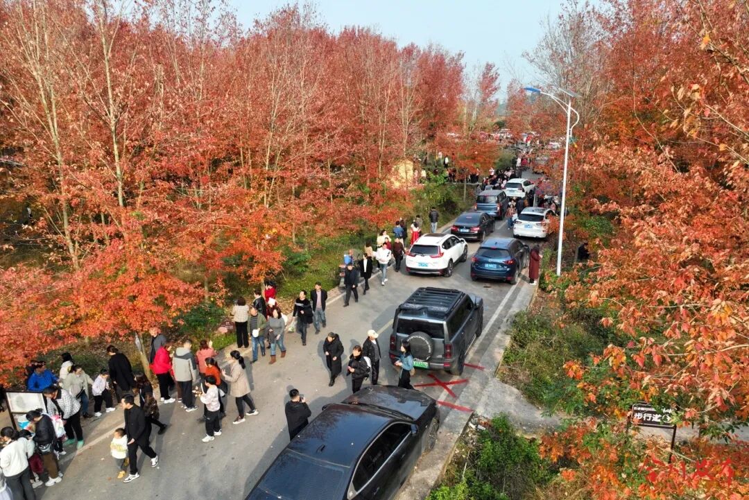 据了解,合川区古楼镇红枫林基地面积约1200亩,栽种有近6万棵红枫。最近一段时间平均每天有近万名游客前来游玩,观赏期还将持续半个月左右。这个藏在乡间的自然美景,不仅为游客提供了就近休闲赏景的好去处,也为乡村振兴注入了文旅活力。